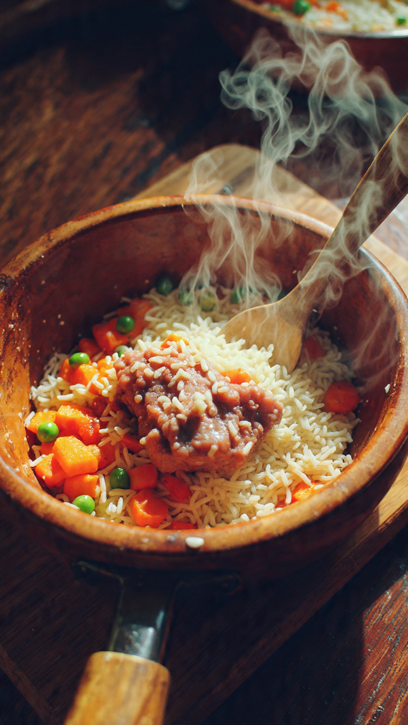 Combines lean beef, rice, and vegetables for complete nutrition.
