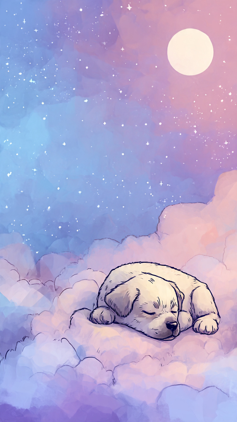 A tiny cartoon puppy curled up for nap time — perfect for cozy vibes.